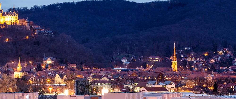 Panorama Stadt Wernigerode zur blauen Stunde. Stadtlichter erzeugen eine besondere Stimmung.
