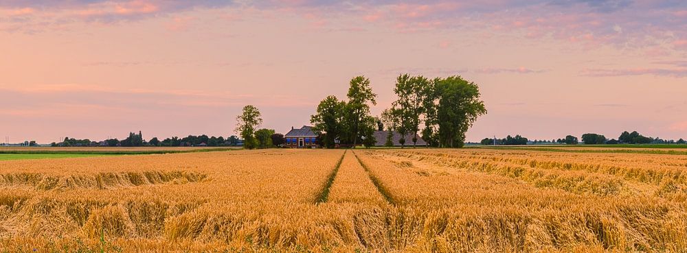 Ein breites 65:24 Xpan-Panoramabild eines Sommerabends über der Landschaft von Groningen bei Thesinge.