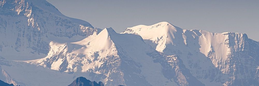 Ein breites 3:1-Panoramabild in sanften Blautönen eines frühen Morgens im Emmental, einem Tal in der Zentralschweiz, im Kanton Bern, mit Blick auf die schneebedeckten Gipfel der Schweizer Alpen im Berner Oberland.