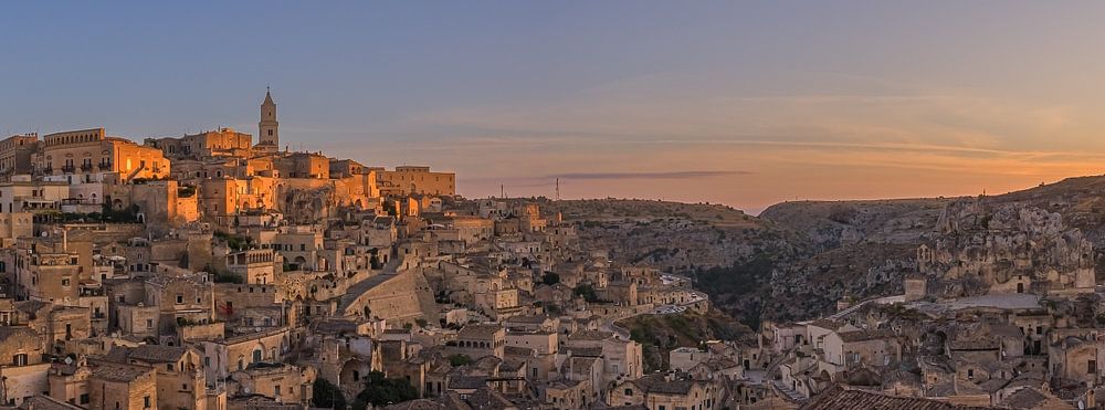 Ein 65x24 Xpan-Panorama-Foto und die ersten Sonnenstrahlen, die sich langsam über den Horizont schieben und einen warmen, gold-orangenen Schein über die antike Stadt Matera werfen.