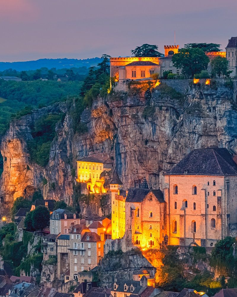 Eine vertikale 4:5 Fotografie eines Abends während des Sonnenuntergangs in Rocamadour, einer Stadt und Pilgerstätte in Frankreich.