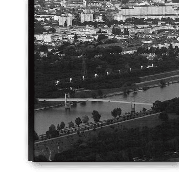 Ein großartiges und weitläufiges Panoramabild in Schwarz-Weiß von der Aussicht auf Wien, Österreichs Hauptstadt. Das Bild wurde vom Gipfel des Leopoldsbergs nach Sonnenuntergang aufgenommen.