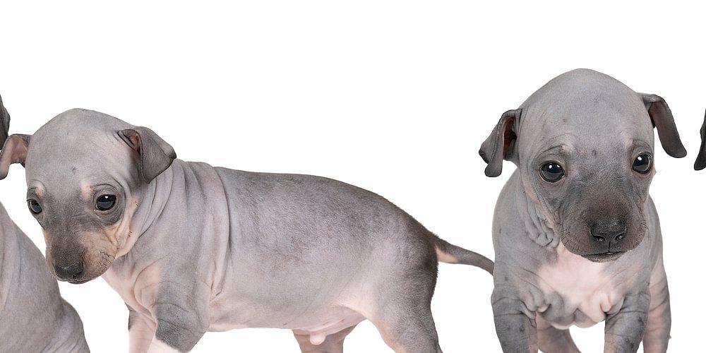 Panorama von vier American Hairless Terrier-Welpen oder amerikanischen Nackthunden vor weißem Hintergrund