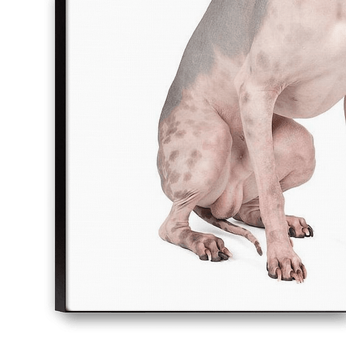 Panorama von vier erwachsenen American Crested Dogs oder American Hairless Terrier vor weißem Hintergrund