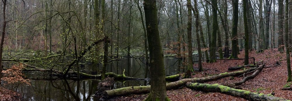 Dieses Panoramafoto habe ich im Wald von Leuvenum in der Nähe der leuvenumse beek(Hierdensche beek) aufgenommen. Für dieses Panorama habe ich 15 Fotos verwendet und sie anschließend in der Nachbearbeitung zusammengefügt. In diesem Waldstück lassen sie den Bach in feuchten Zeiten überlaufen, deshalb ist dieses Waldstück nicht mehr begehbar. Ansonsten ist es eine für die Veluwe charakteristische Landschaft, die Sie hier sehen. Die Stelle, von der aus ich dieses Panoramafoto aufnahm, lag etwas höher als der Bach, weshalb ich mein Stativ, auf dem meine Kamera stand, nicht ganz ausgefahren hatte.