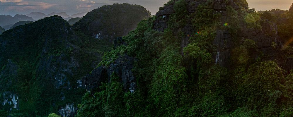 Panorama der beliebten Ansicht von Ninh Binh, den Gipfeln von Tam Coc, Vietnam. Sonnenuntergang mit Blick auf Berggipfel und einen Fluss mit vielen Booten. Orientalische Wanddekoration.