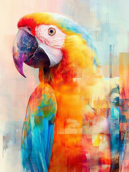Ein explosives Farbenmeer. Dieses moderne Motiv im Stile einer Digitalcollage fängt die Essenz eines tropischen Papageis in einem dynamischen, abstrakten Farbrausch ein. Der Hintergrund zerfließt in malerische Strukturen und geometrische Formen.
