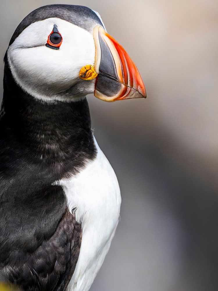 Ein Papageientaucher steht wachsam am Rande eines Felsens, sein markanter orangefarbener Schnabel hebt sich deutlich vom weichen Hintergrund ab. Das elegante Porträt zeigt das einzigartige Aussehen dieses Vogels, der ein Symbol für die nördlichen Küsten ist.