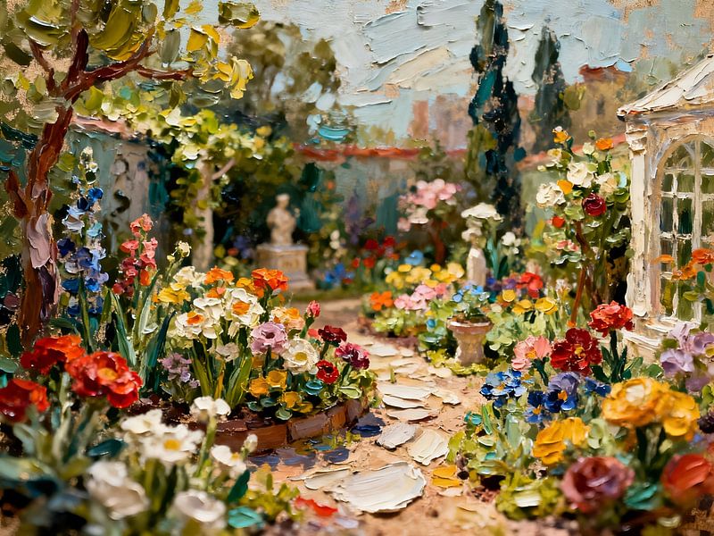 Ein farbenfrohes Gartenmotiv voller Leben und Detailreichtum. Verschiedene Blumenarten in leuchtenden Farben säumen einen kleinen Weg, der durch die Szene führt. Im Hintergrund sind architektonische Elemente angedeutet, die dem Bild eine mediterrane Anmutung verleihen. Die lockere, impressionistische Malweise sorgt für eine lebendige…