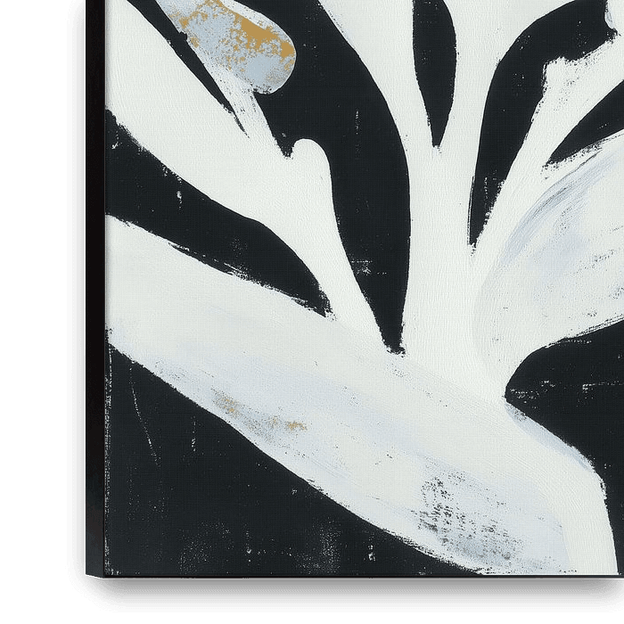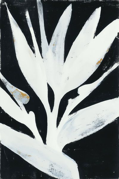 Auffällige weiße Paradiesvogelblume vor einem dramatischen schwarzen Hintergrund mit goldenen Akzenten auf den Blütenblättern. Kräftige Pinselstriche und hoher Kontrast schaffen ein modernes botanisches Statement.