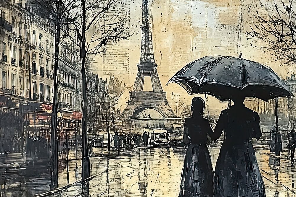 Schlüsselwörter: Paris-Gemälde in Sepia, romantische Stadtbildkunst, französische Wanddekoration, nostalgisches Paris-Interieur, Vintage-Stadtbildmalerei, romantischer Paris-Spaziergang, Sepia-Kunstwerk Frankreich