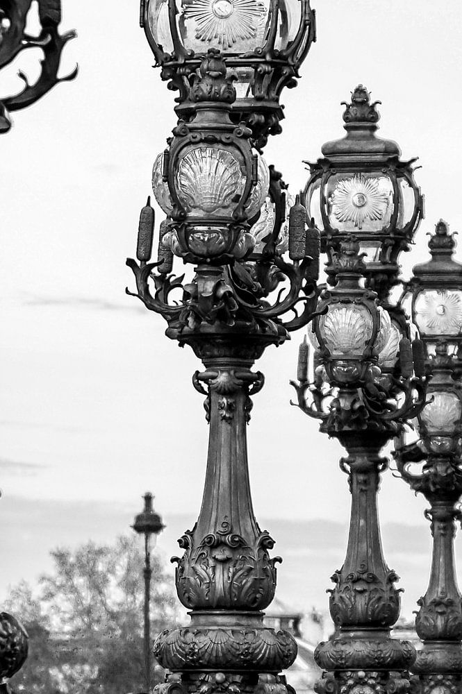 Schwarz-Weiß-Foto der schönen, reich verzierten Straßenlaternen auf der Pont Alexandre III in Paris