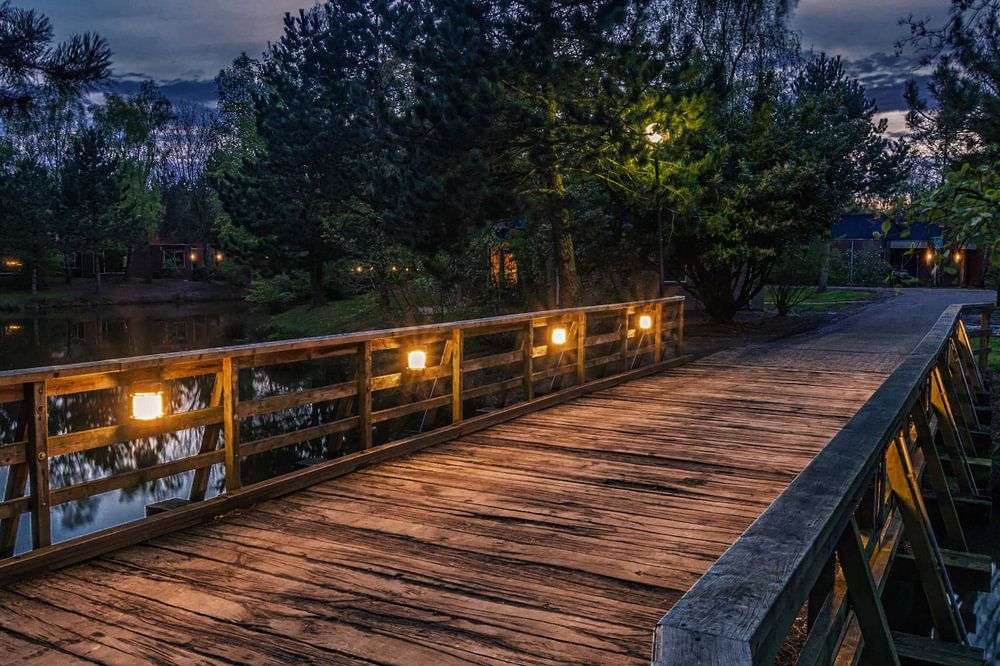 Genomen op het Roompot park de Weerterbergen. een van de vele bruggen op het park tijdens het blauwe uurtje.