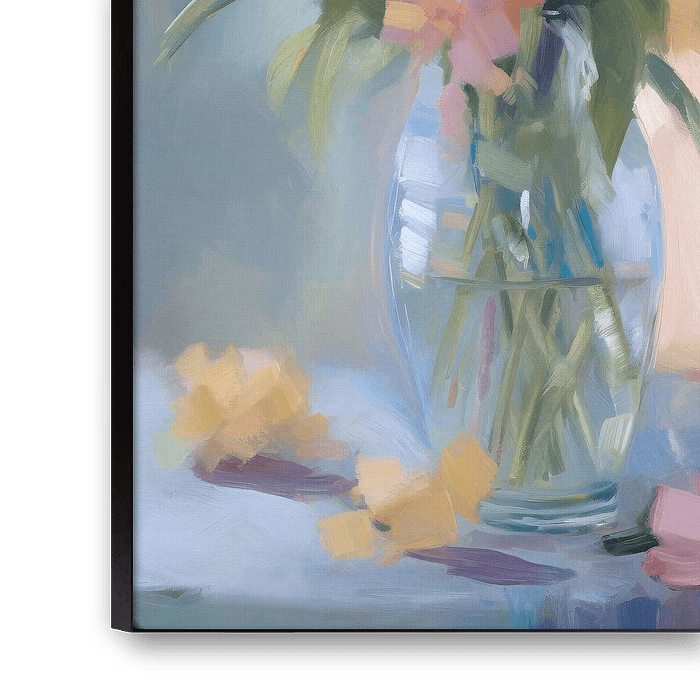 Impressionistisches Porträt eines Blumenstraußes in einer Glasvase. Mischtechnik in sanften Pastelltönen mit einer fröhlichen Frühlingsstimmung.