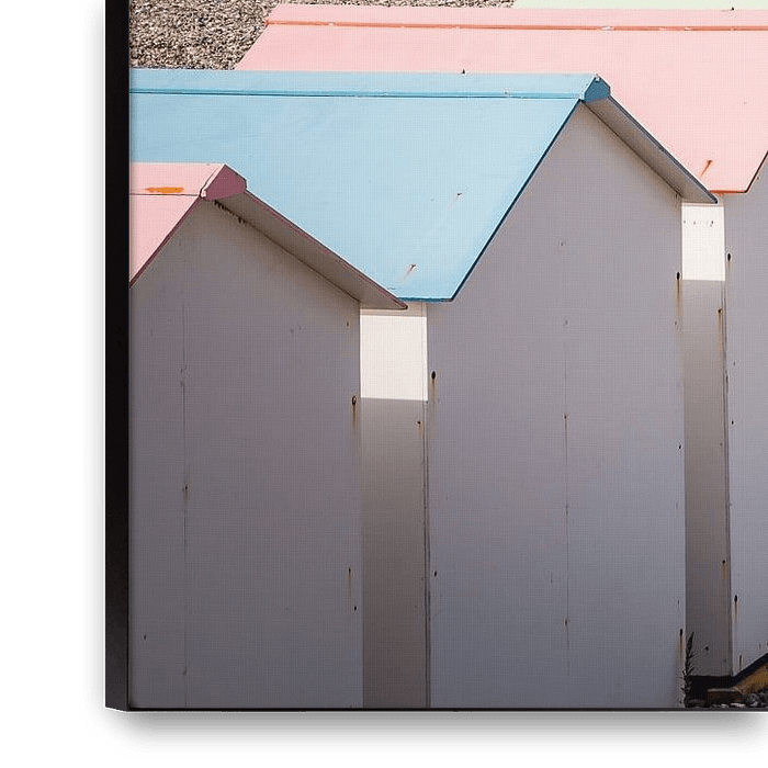 Eine Reihe weißer Strandhäuser in Le Tréport in der Normandie präsentiert sich von ihrer Rückseite und bildet eine klare, fast grafische Komposition entlang des Kiesstrandes. Die Dächer in sanften Pastelltönen setzen farbige Akzente und verleihen der Szene Leichtigkeit und sommerliche Frische. Das Sonnenlicht wirft klare Schatten auf…