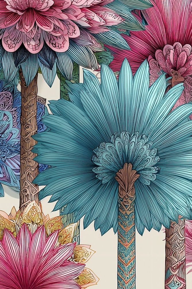 Eine botanische Illustration, in der anmutige Palmen und üppige Blumen in einer harmonischen Palette aus Türkis, Rosa und Gold verschmelzen. Die stilisierten Blumen wirken mandalaartig, mit detaillierten Mustern, die an Art-déco-Designs erinnern. Die Komposition strahlt sowohl tropischen Luxus als auch künstlerische Raffinesse aus.