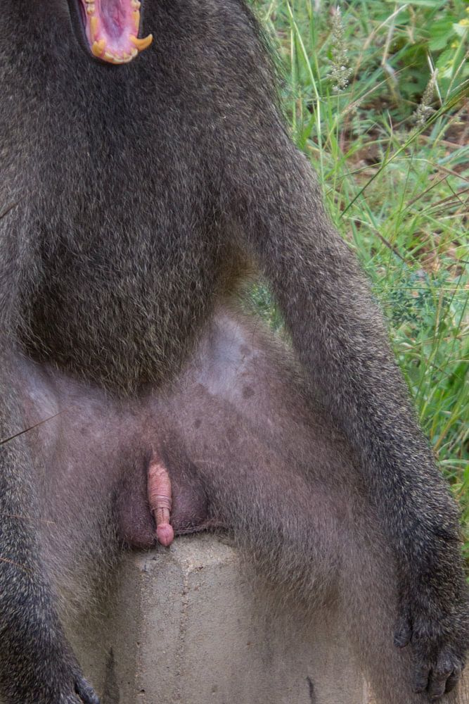 Pavian zeigt seine Zähne (unter anderem) in der Nähe des Lagers Lower Sabie, Kruger-Nationalpark, Südafrika
