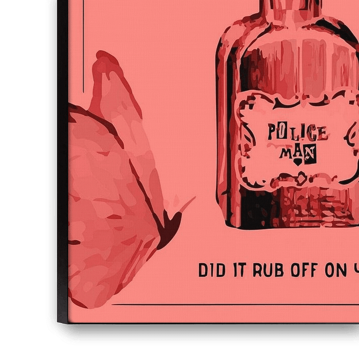 Plakat im Retro-Stil mit einer Parfümflasche mit der Aufschrift "POLICE MAN" und dem geheimnisvollen Text "And I Can Still Smell Her Perfume", der ein sinnliches, geheimnisvolles und künstlerisches Gefühl vermittelt.