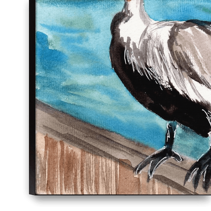 Bestelle dieses Vögel Wandbild Pelikan am Pier von Sebastian Grafmann als Reproduktion auf Leinwand, Alu-Dibond, als Poster, Fototapete, ArtFrame oder Acrylglasbild, maßgefertigt in höchster Qualität.