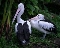 Ein Pelikanpaar im Wildpark in Bogor, West-Java, Indonesien. Pelikane kommen in Indonesien nicht in freier Wildbahn vor.