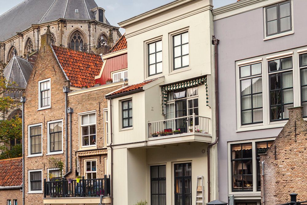 Pelserbrug und Grachtenhäuser entlang des Voorstraathaven mit der Grote Kerk im Hintergrund in Dordrecht