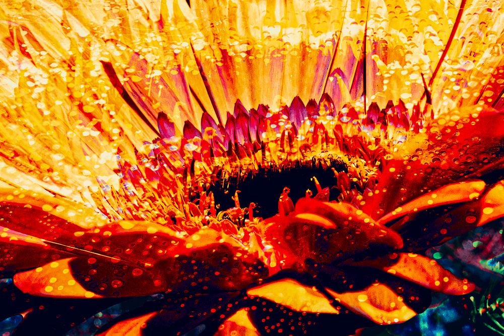 Eine sehr große orangefarbene und rote Gerbera in einer frischen, fröhlichen blauen und grünen Umgebung. Die Gerbera steht in einer farbenfrohen Welt voller kleiner frischer Wassertropfen, die ein wenig surrealistisch wirkt...