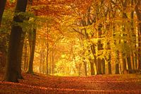 Weg durch eine Landschaft mit Buchen mit goldenen Blättern in einem Wald an einem schönen Herbsttag im Naturschutzgebiet Veluwe in Gelderland. Das Sonnenlicht scheint durch die Baumkronen auf die goldgelben Blätter.