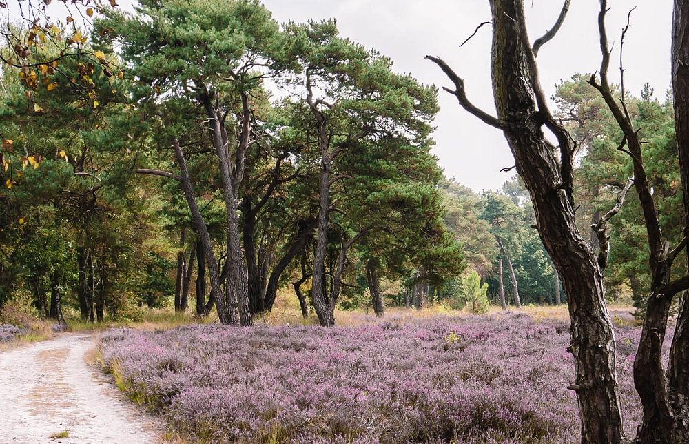 Mitte August, als das Heidekraut prächtig blühte und ein wunderschönes Purpurrosa ausstrahlte, hatten viele Bäume bereits mit der Trockenheit zu kämpfen, und die Blätter wurden hier und da braun und fielen zu Boden. Das kann man auch hier sehen, mit den Blättern im Vordergrund auf dem Weg. Damals ein trauriger Anblick, aber für das Foto war es ein schönes Motiv. Der Weg führt Sie schön durch das Bild und macht Sie neugierig auf das, was als nächstes kommt.