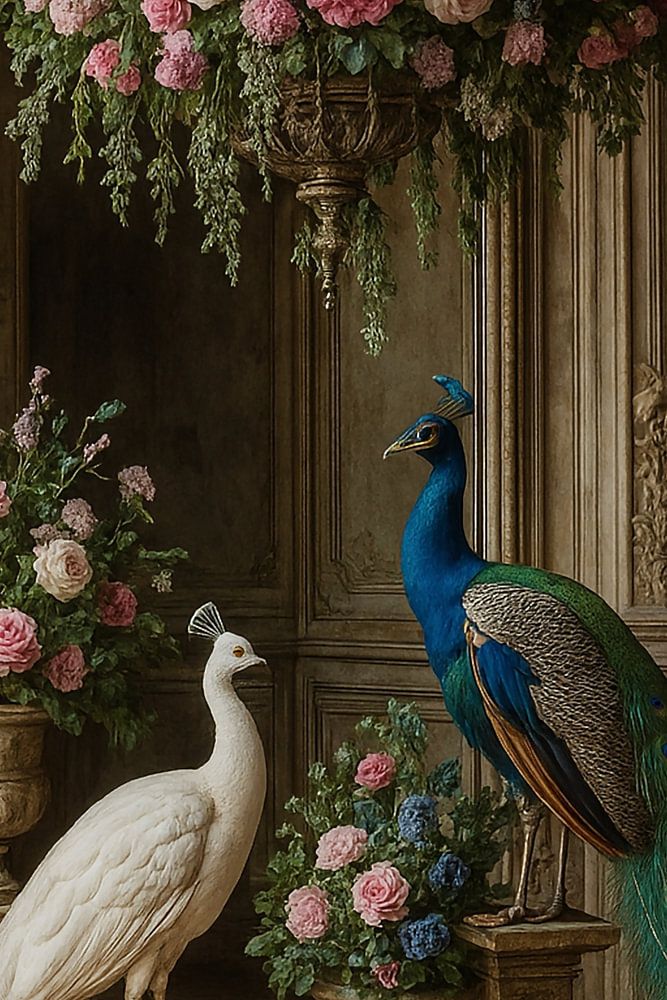 Dieses elegante Kunstwerk zeigt einen majestätischen blauen Pfau neben einem seltenen weißen Pfau, umgeben von üppigen Blumenarrangements voller Rosen und Hortensien. Der klassische Rahmen und die reichhaltigen Details sorgen für einen zeitlosen, königlichen Look, der perfekt in ein stilvolles Interieur passt.