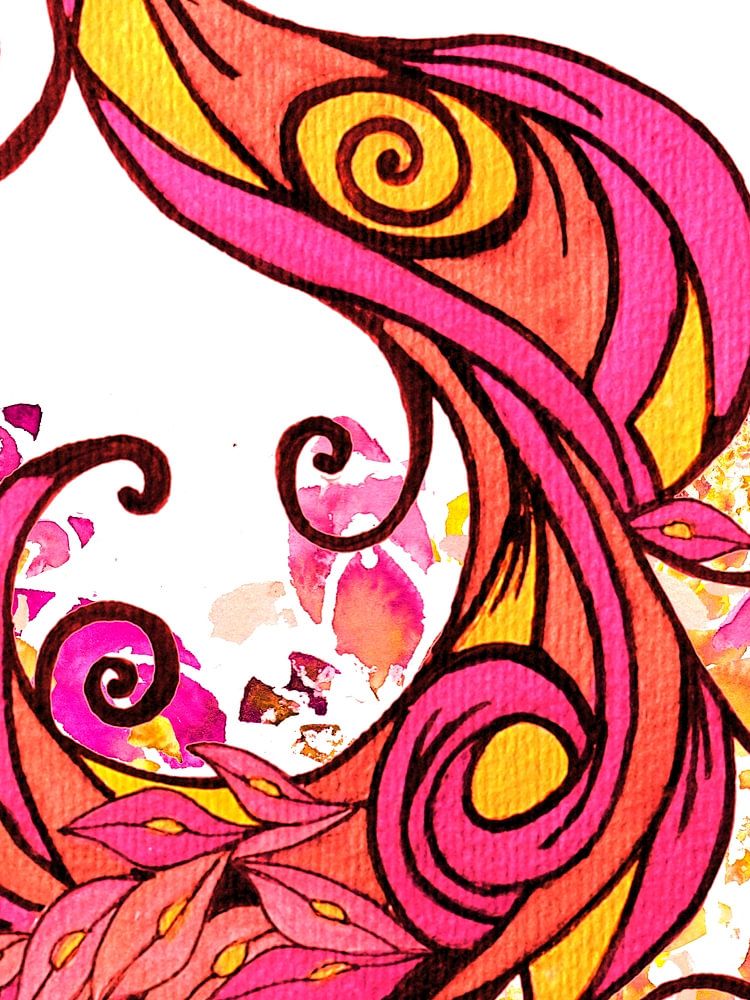ein Mixed Media Kunstwerk von einem stilisierten Pfau in rosa und goldenen Farben mit schmückenden Mandala Elementen im Hintergrund.