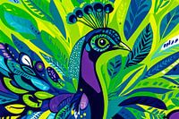 Dieses Design bringt eine Explosion von Farben und Leben in jeden Raum. Mit der surrealen Darstellung eines Pfaus, der von leuchtend grünen und blauen Blättern umgeben ist, schafft es einen auffälligen Blickpunkt in Ihrem Interieur. Dieses Bild ist ideal für Liebhaber moderner Kunst und der Natur und verleiht jedem Raum, ob im…
