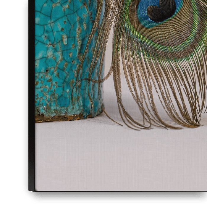 Bestelle dieses Stilleben Pfauenfeder in einem aquablauen Glas mit Deckel von Aan Kant als Reproduktion auf Leinwand, Alu-Dibond, als Poster, Fototapete oder Acrylglasbild.
