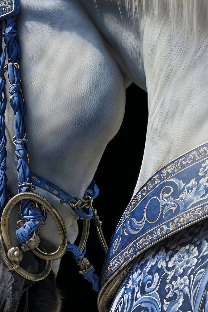 Schönes Pferd, ein Schimmel, mit Delfter Blau Dekorationen und Zaumzeug. Das Pferd steht vor einem dunklen Hintergrund, wodurch das Porträt besonders kraftvoll wirkt. Für jeden Reiter oder Pferdeliebhaber ein wertvolles Kunstwerk an der Wand oder auch schön für eine schicke Stall.