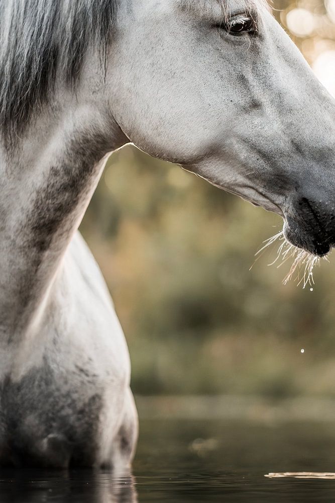 Dieses heitere Kunstwerk zeigt ein graues Pferd, das halb untergetaucht im stillen Wasser steht und seinen Blick sanft auf den Horizont gerichtet hat. Der weiche Hintergrund aus goldenen Lichtflecken zwischen den Bäumen verstärkt das Gefühl von Ruhe und Kontemplation. Wassertropfen gleiten von der Schnauze des Tieres ab und bringen subtile Bewegung in die ansonsten ruhige Komposition. Die warmen, gedämpften Farben und die Spiegelung im Wasser schaffen eine verträumte Atmosphäre, die den Betrachter zur Selbstbetrachtung einlädt. Ideal für Liebhaber der Pferdefotografie mit einem ruhigen, natürlichen Look.