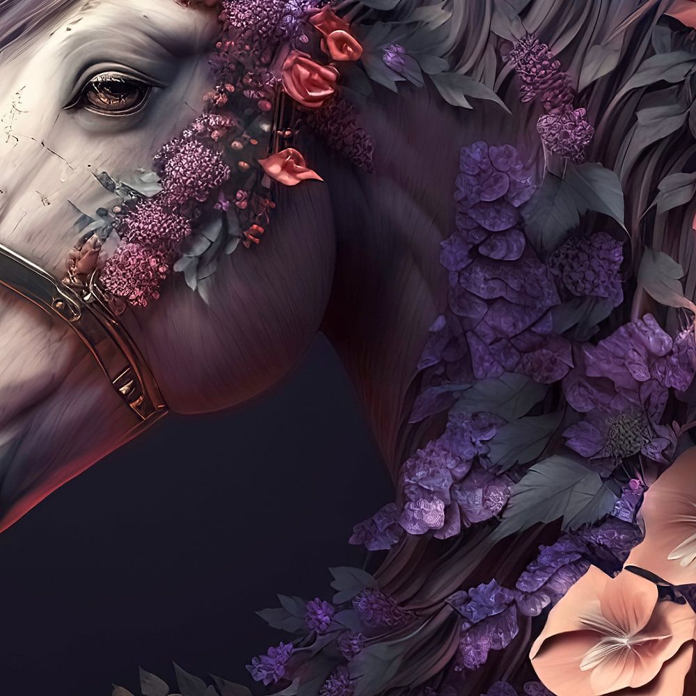 Pferd mit Blumen. Dieses Bild wurde mit künstlicher Intelligenz (KI) erstellt.