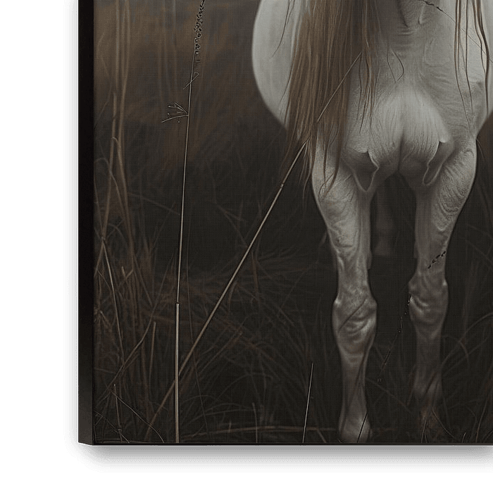 Diese fesselnde Darstellung eines weißen Pferdes, das in die nebelverhangene Morgendämmerung eingebettet ist, spricht Bände über die Ruhe und das Geheimnisvolle der Natur. Die sorgfältige Komposition betont das sanfte Licht, das das glänzende Fell und die weichen, fließenden Mähnen hervorhebt und einen starken Kontrast zum umgebenden Dunst schafft. Das Pferd steht stolz, doch ruhig, und seine klaren Augen blicken durch den Nebel, als würde es zu einer unentdeckten Welt jenseits des Bildes gehören. Diese Arbeit ist nicht nur ein Muss für Pferdeliebhaber, sondern auch für Sammler, die die Symbolik der Freiheit und Stärke in ihrer Kunst schätzen. Ein Blickfang in jedem Raum, vermittelt dieses Bild eine Botschaft von Hoffnung und Schönheit, die sich sanft mit dem Mysterium des Unbekannten vermischt.