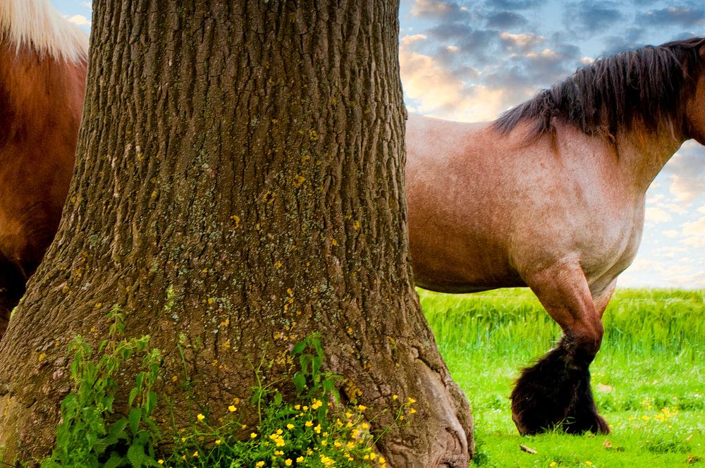 Pferde, die Verstecken spielen. So sieht es meiner Meinung nach aus. Auf jeden Fall macht es mich jedes Mal glücklich, wenn ich es ansehe. Alles an diesem Bild ist sehr verspielt, die Komposition, die Wolkendecke, sogar der Futterautomat sieht aus wie ein Karussell.