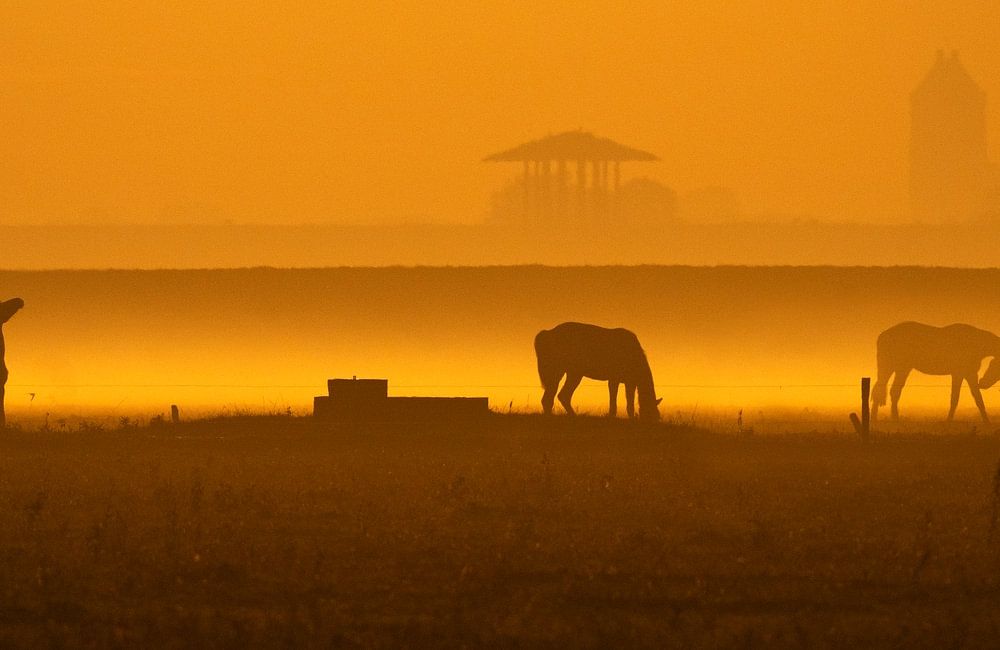 Pferde auf der friesischen Salzwiese am Morgen bei Nebel