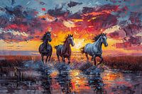 Ein lebhaftes Gemälde, das drei galoppierende Pferde bei einem farbenfrohen Sonnenuntergang darstellt.