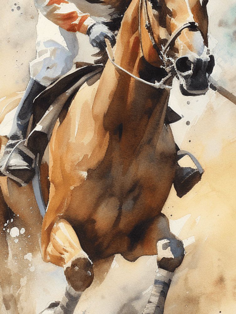 Dieses dynamische Aquarell fängt die Aufregung eines Pferderennens in einem flüchtigen, impressionistischen Stil ein. Im Vordergrund galoppieren Pferde mit ihren Jockeys in voller Aktion, wobei der vorderste Reiter in einem roten Helm und hellrosa Trikot besonders hervorsticht. Die Bewegung wird durch aufspritzenden Staub und verschwommene Linien kunstvoll dargestellt. Der Himmel zeigt leichte Wolken und trägt zur lebendigen, aber ätherischen Atmosphäre bei. Das Gemälde vermittelt ein Gefühl von Geschwindigkeit, Energie und der Schönheit des Moments.