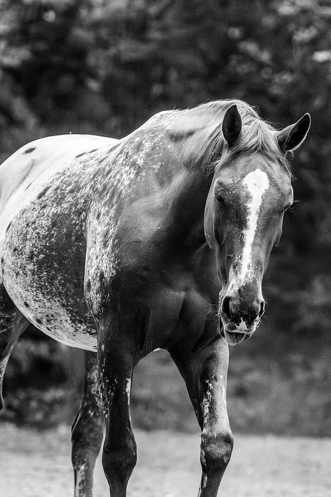 Diese eindrucksvolle Schwarz-Weiß-Fotografie zeigt ein geflecktes Pferd, das ruhig über einen staubigen Boden schreitet, umgeben von einem bewaldeten Hintergrund. Sanfte Lichtstrahlen brechen durch das Laub und erzeugen ein fast magisches Lichtspiel um das Tier. Der Kontrast zwischen der muskulösen Gestalt des Pferdes und der verträumten Atmosphäre verleiht dem Bild eine poetische Kraft. Eine zeitlose Komposition, die Bewegung, Ruhe und natürliche Schönheit perfekt ausbalanciert.