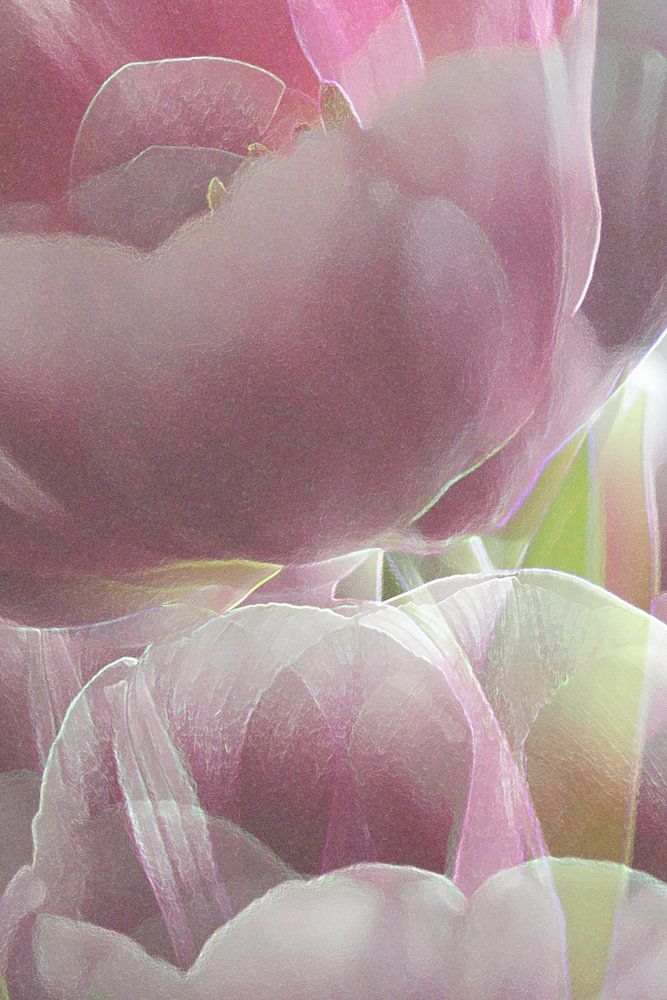 Eine pfingstrosenähnliche Tulpe von tiefrosa Farbe mit schönen weißen Rändern. Das digital bearbeitete Bild vermittelt eine mystische Atmosphäre und das Gefühl, dass die Zeit verschwimmt. Auch ein romantisches Bild.