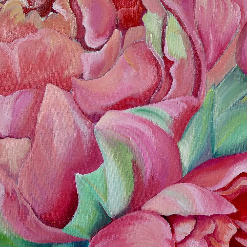 Blumengemälde in rosa und roten Farbtönen. Gemalt mit Öl auf Leinwand Leinwand. Die rosa roten weichen k;euren sind schön mit dem Grün ausgeglichen. Farbenfroh und romantisch.