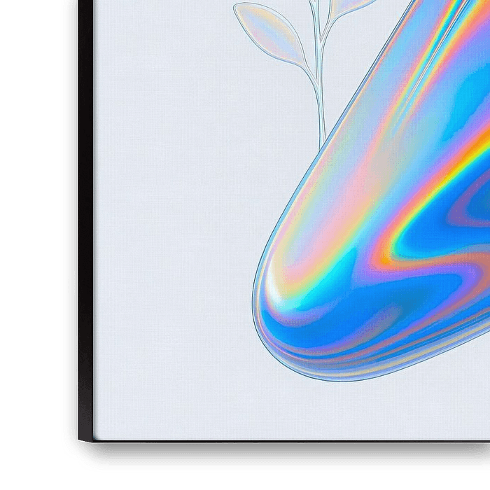 Die Komposition ist in zwei visuelle Bereiche gegliedert: Links eine stilisierte Pflanze mit verlängerten, durchscheinenden Blättern, die mit feinen Linien und sanften irisierenden Farbverläufen gestaltet sind; rechts eine kühne, amorphe Figur voller wirbelnder Farben und glänzender Textur.