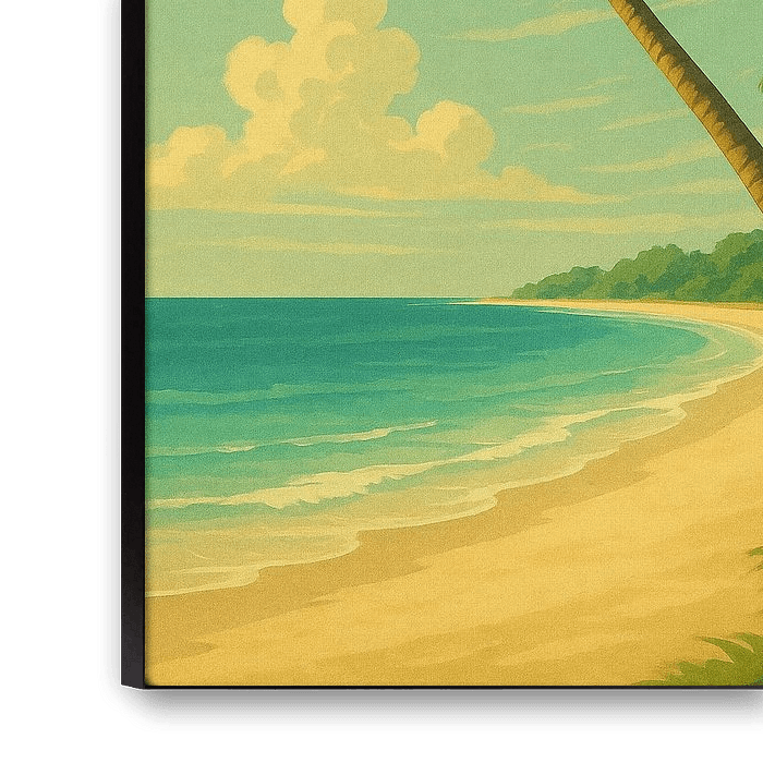 Dieses Kunstwerk ist ideal für Liebhaber von tropischen Landschaften, Strandurlauben und friedlicher Inneneinrichtung. Mit seiner beruhigenden Farbpalette eignet es sich perfekt für Schlafzimmer, Wohnzimmer, Kreativräume oder überall dort, wo ein Hauch von Inselflair angebracht ist.
