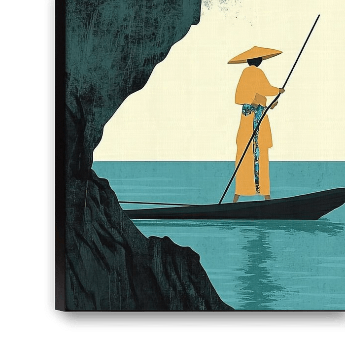 Grafische Darstellung eines Thailänders auf einem Holzboot in Phuket, Thailand, in blaugrauen Farbtönen und fröhlichem Gelb. Von links nähert er sich hinter einem Felsen mit einem Stock in der Hand. Der Thai ist traditionell gekleidet und scheint sich langsam durch das Wasser zu bewegen. Er segelt auf dem Meer und im Hintergrund sehen wir die imposanten Felsen im Meer, die für Phuket in Thailand charakteristisch sind. das Kunstwerk vermittelt ein Urlaubsgefühl.