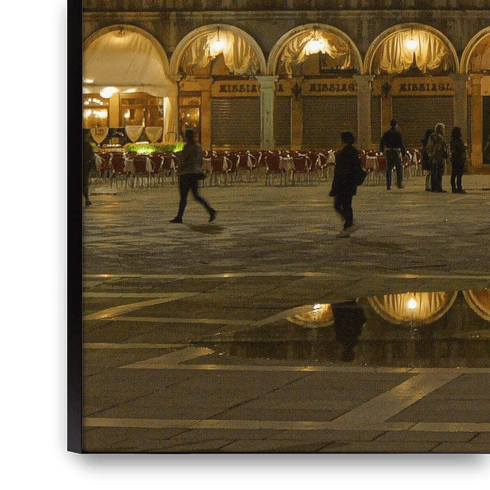 Piazza San Marco, Venetië, Italië, in het donker. Op een regenachtige avond weerspiegelen de gallerijen en lichtjes in een grote plas water op het plein.