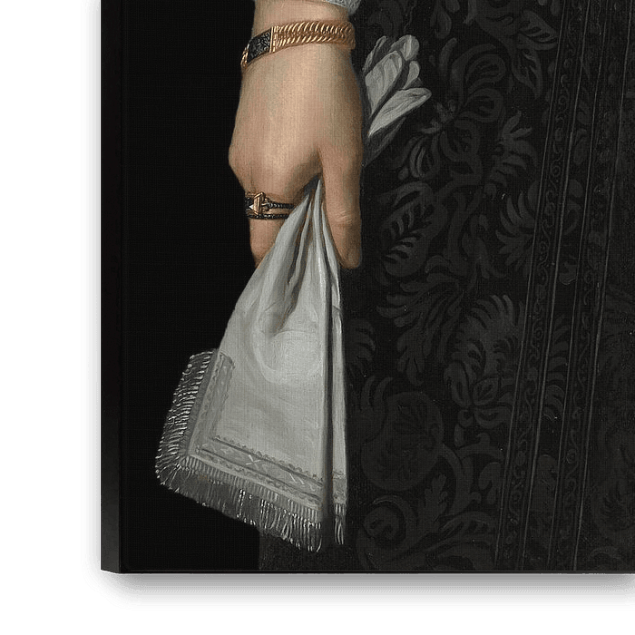 Ich habe das Gemälde hier und da ein wenig digital verbessert, nicht zu viel und nicht zu wenig, und es auf einen schlichten schwarzen Hintergrund zugeschnitten, damit sich die ganze Aufmerksamkeit auf die schönen Details der Kleidung, der Handschuhe und des Schmucks richtet.