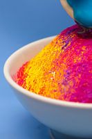 Vor einem himmelblauen Hintergrund steht eine weiße Schale, in der Farbpigmente zu einem kleinen Türmchen aufgeschichtet sind. Die Farben Gelb, Rosa, Rot und Lila bilden dabei einen lebendigen, fast skulpturalen Farbblock, der durch seine klare Form sofort ins Auge fällt. Von oben rechts fließt eine blaue Flüssigkeit auf das Gebilde und…