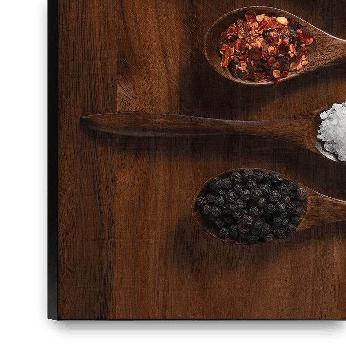 Gewürze und Kräuter - wir alle verwenden sie in der Küche, und sie verdienen es eigentlich, im Rampenlicht zu stehen. An der Küchenwand, zum Beispiel! Eine Auswahl an häufig verwendeten Gewürzen auf Holzlöffeln. Warme Töne, wärmende Gerichte.